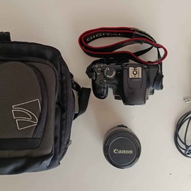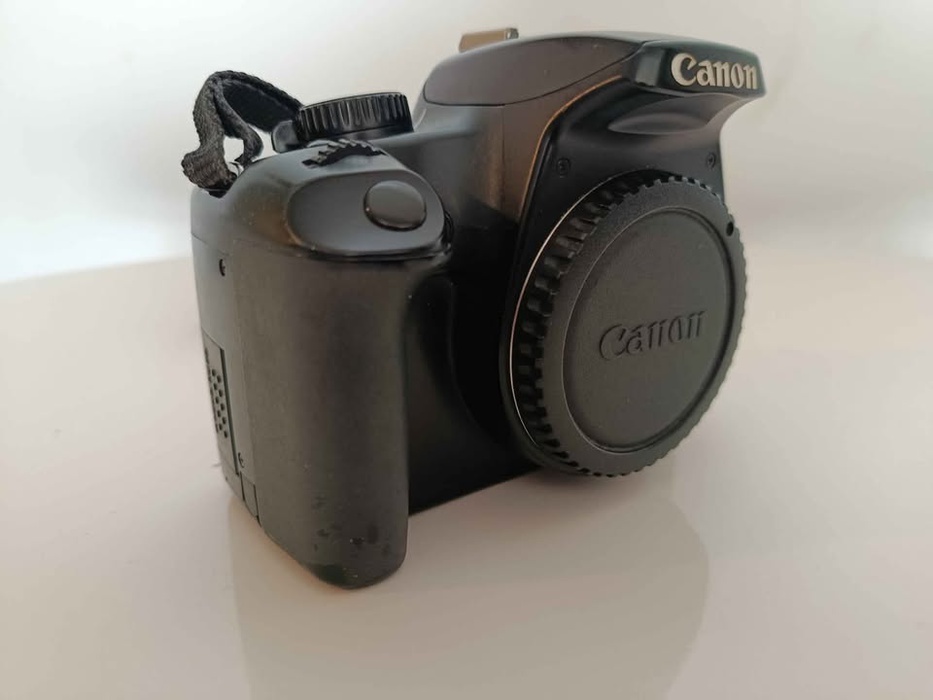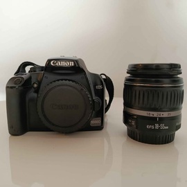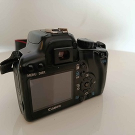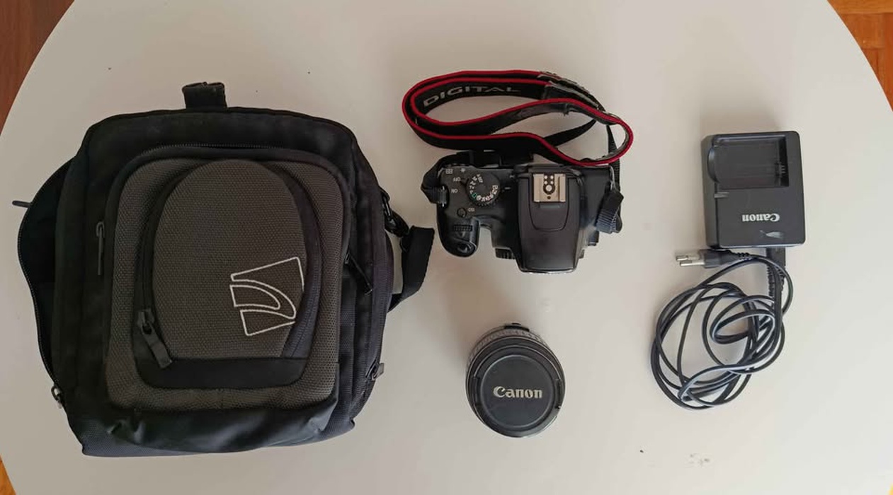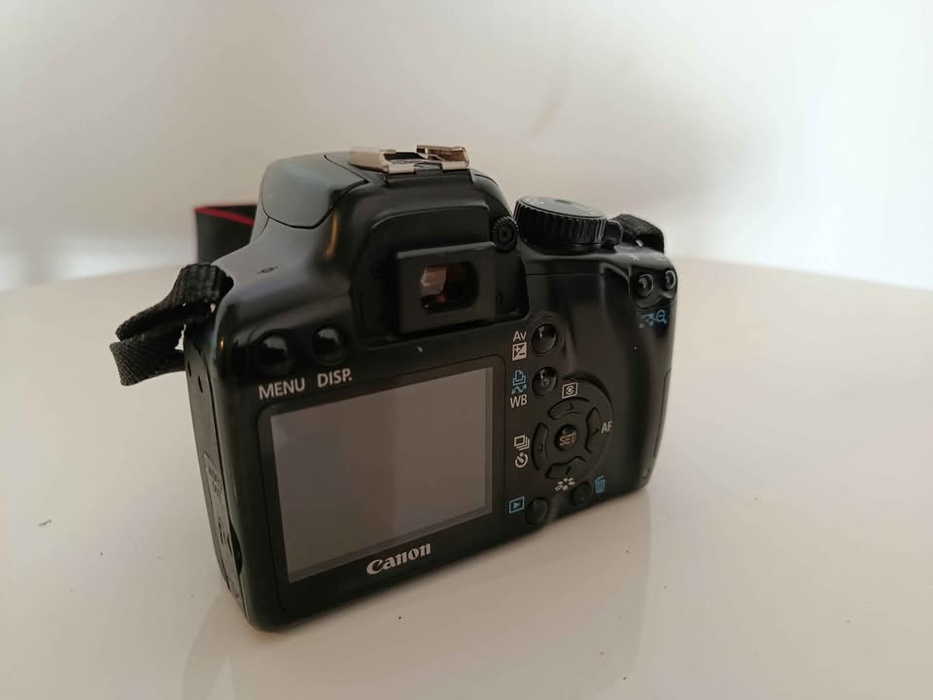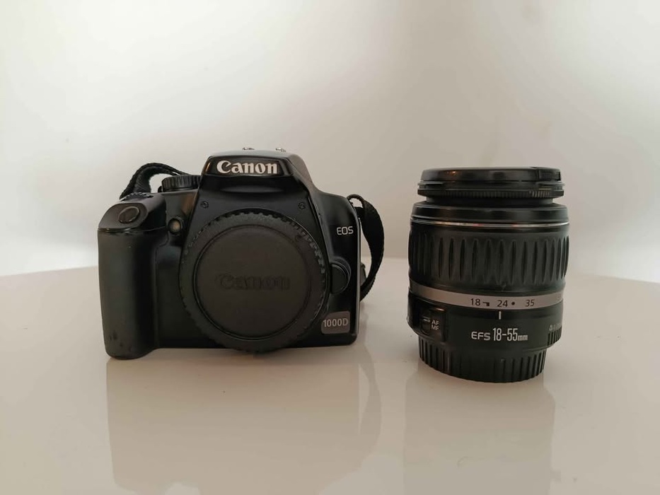 Μεταχειρισμένη φωτογραφική κάμερα DSLR Canon EOS 1000 D Kit - Φακός (Canon EF- S 18 - 55 mm). Το πακέτο περιλαμβάνει σώμα, φακό, ιμάντα canon, φορτιστή μπαταρίας και θήκη. Κατάσταση: Η κάμερα έχει περάσει πρόσφατο έλεγχο και είναι πλήρως λειτουργική. Θα μπορο΄ύσε να κάνει κανείς προαιρετικό service το οποίο μπορεί να συνεχιστεί κατά προτίμηση (45ευρώ), ώστε να επισκευαστούν τα εξής: - Η υποδοχή της κάρτας sd. Παρουσιάζει μια ιδιαιτερότητα, ενώ είναι λειτουργική. Κουμπώνει με το κλείσιμο του καπακιού, αλλά μπορεί να επισκευαστεί πλήρως, ώστε να γίνεται το κλικ της εισχώρησης αυτόματα. (κόστος 25ευρώ) - Καθαρισμός viewfinder (κόστος 20ευρω)